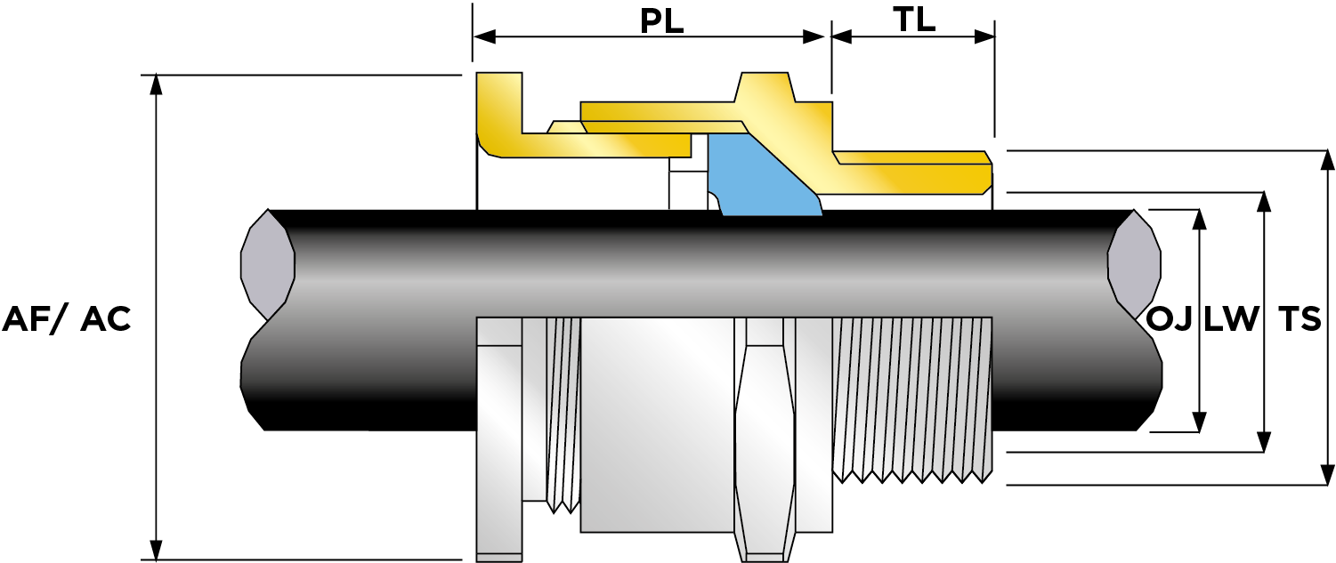 | Part Number | Size | Material | Entry Thread | Entry Thread Size TS | Entry Thread Pitch TP | Min Overall Cable Ø OS (mm) | Max Overall Cable Ø OS (mm) | Min Overall Cable Ø OS (Imp) | Max Overall Cable Ø OS (Imp) | Min Thread Length TL (mm) | Min Thread Length TL (Imp) | Max Across Flats AF (mm) | Max Across Corners AC (mm) | Max Across Flats AF (Imp) | Max Across Corners AC (Imp) | Max Protrusion Length PL (mm) | Ass'y Weight | |