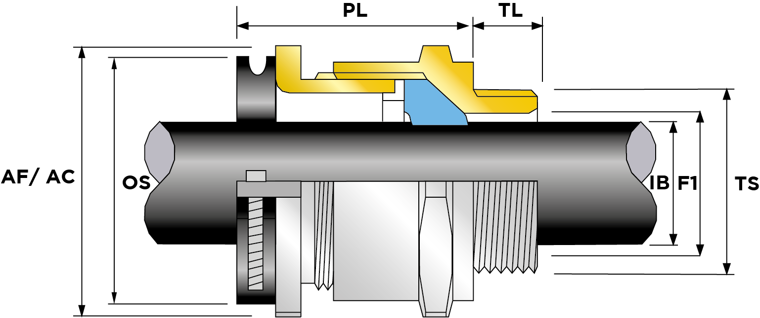 | Part Number | Size | Material | Entry Thread | Entry Thread Size TS | Entry Thread Pitch TP | Min Overall Cable Ø OS (mm) | Max Overall Cable Ø OS (mm) | Min Overall Cable Ø OS (Imp) | Max Overall Cable Ø OS (Imp) | Min Thread Length TL (mm) | Min Thread Length TL (Imp) | Max Across Flats AF (mm) | Max Across Corners AC (mm) | Max Across Flats AF (Imp) | Max Across Corners AC (Imp) | Max Protrusion Length PL (mm) | Ass'y Weight | |