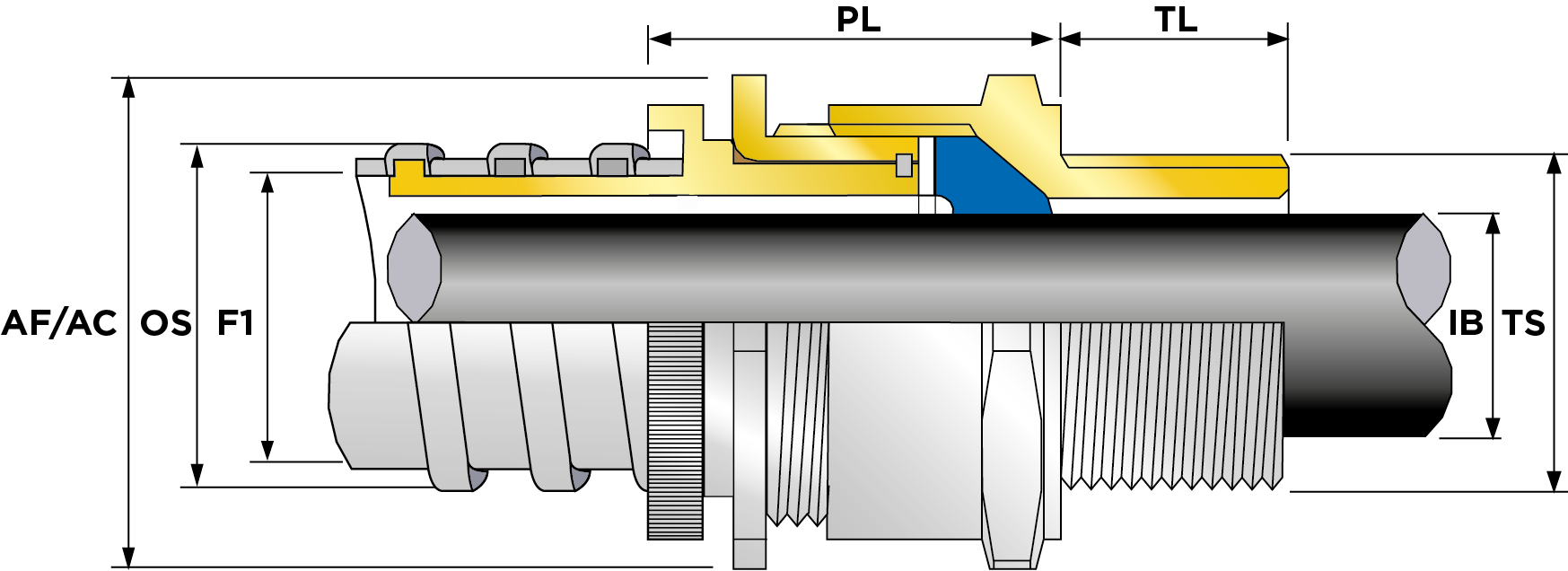 | Part Number | Size | Material | Entry Thread | Entry Thread Size TS | Entry Thread Pitch TP | Max Envelope Dia EØ (mm) | Max External Conduit Dia C2 (mm) | Min Overall Cable Ø OS (mm) | Max Overall Cable Ø OS (mm) | Min Overall Cable Ø OS (Imp) | Max Overall Cable Ø OS (Imp) | Min Thread Length TL (mm) | Min Thread Length TL (Imp) | Max Across Flats AF (mm) | Max Across Corners AC (mm) | Max Across Flats AF (Imp) | Max Across Corners AC (Imp) | Max Protrusion Length PL (mm) | Nom Internal Conduit Ø C1 (mm) | Ass'y Weight | |