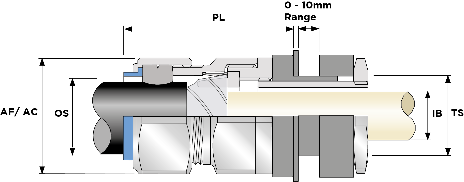 | Part Number | Size | Material | Min Overall Cable Ø OS (mm) | Max Overall Cable Ø OS (mm) | Min Overall Cable Ø OS (Imp) | Max Overall Cable Ø OS (Imp) | Max Across Flats AF (mm) | Max Across Corners AC (mm) | Max Across Flats AF (Imp) | Max Across Corners AC (Imp) | Max Protrusion Length PL (mm) | Clearance Hole Diameter (mm) | Clearance Hole Diameter (Imp) | Max Cable Bedding Ø IB (mm) | Max Cable Bedding Ø IB (Imp) | Min Cable Bedding Ø IB (Imp) | Min Armour Thickness X Cone X1 (mm) | Max Armour Thickness X Cone X1 (mm) | Min Armour Thickness X Cone X1 (Imp) | Shroud Size | Ass'y Weight | |