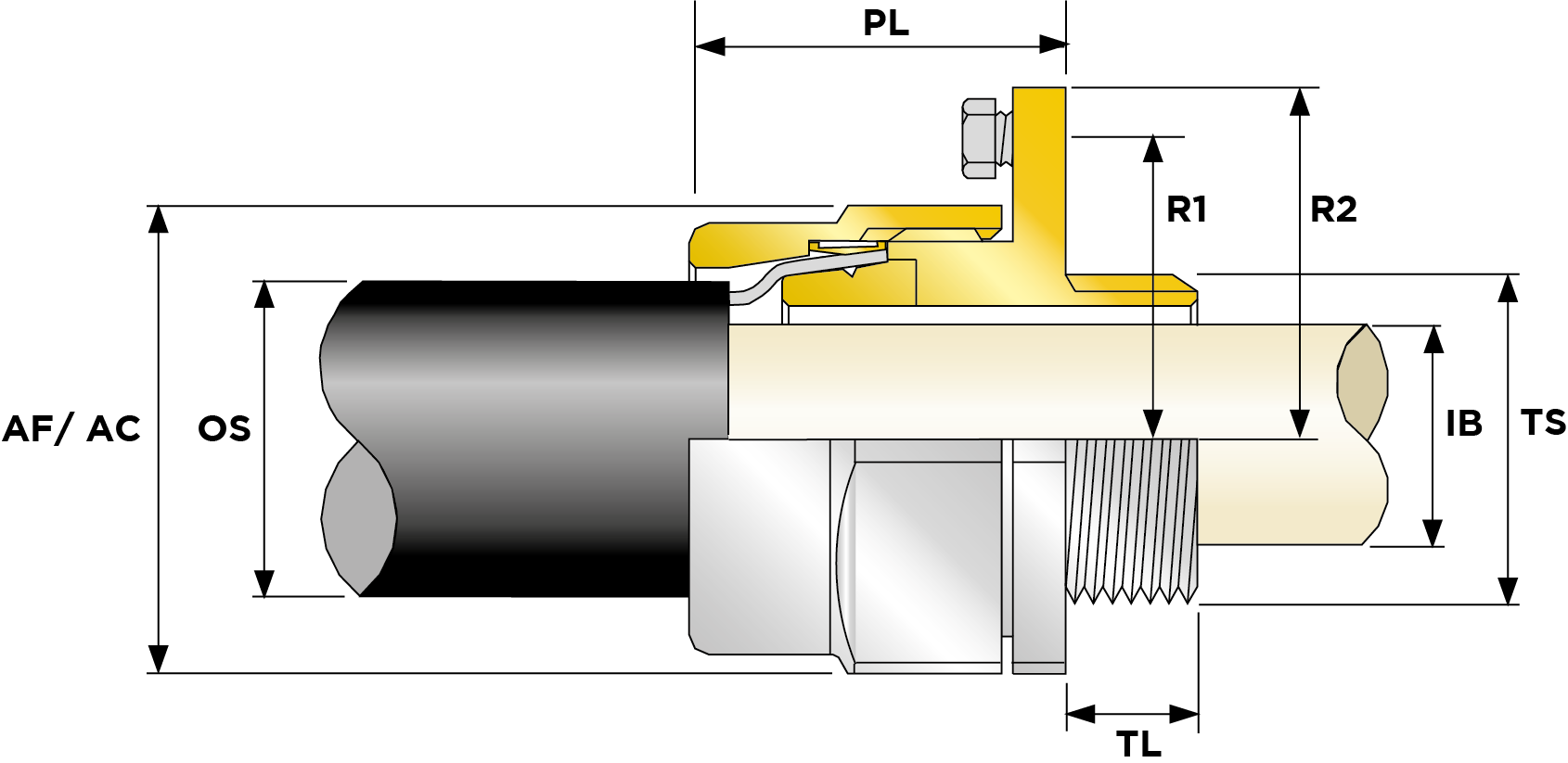 | Part Number | Size | Material | CIEL Earth Bolt Size EB | Entry Thread | Entry Thread Size TS | Entry Thread Pitch TP | Min Overall Cable Ø OS (mm) | Max Overall Cable Ø OS (mm) | Min Overall Cable Ø OS (Imp) | Max Overall Cable Ø OS (Imp) | Min Thread Length TL (mm) | Min Thread Length TL (Imp) | Max Across Flats AF (mm) | Max Across Corners AC (mm) | Max Across Flats AF (Imp) | Max Across Corners AC (Imp) | Symmetrical Fault Current (kA) rating for 1 second | Max Protrusion Length PL (mm) | Nom C-to-C Radius R1 (mm) | Nom C-to-Extremity Radius R2 (mm) | Max Cable Bedding Ø IB (mm) | Max Cable Bedding Ø IB (Imp) | Min Cable Bedding Ø IB (Imp) | Min Armour Thickness W Cone W1 (mm) | Max Armour Thickness W Cone W1 (mm) | Min Armour Thickness W Cone W1 (Imp) | Max Armour Thickness W Cone W1 (Imp) | Ass'y Weight | |