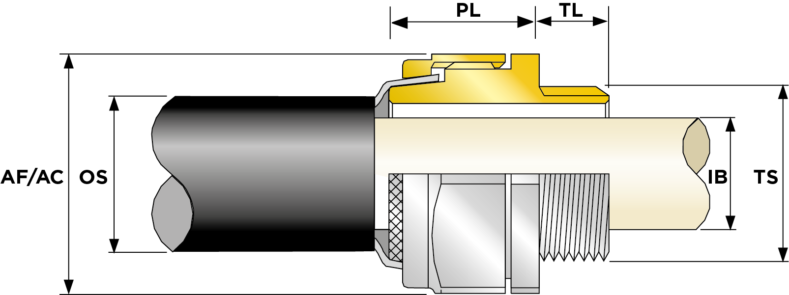 | Part Number | Size | Material | Entry Thread | Entry Thread Size TS | Entry Thread Pitch TP | Min Overall Cable Ø OS (mm) | Max Overall Cable Ø OS (mm) | Min Overall Cable Ø OS (Imp) | Max Overall Cable Ø OS (Imp) | Min Thread Length TL (mm) | Min Thread Length TL (Imp) | Max Across Flats AF (mm) | Max Across Corners AC (mm) | Max Across Flats AF (Imp) | Max Across Corners AC (Imp) | Max Protrusion Length PL (mm) | Max Cable Bedding Ø IB (mm) | Max Cable Bedding Ø IB (Imp) | Min Cable Bedding Ø IB (Imp) | Min Armour Thickness W Cone W1 (mm) | Max Armour Thickness W Cone W1 (mm) | Min Armour Thickness W Cone W1 (Imp) | Max Armour Thickness W Cone W1 (Imp) | Shroud Size | Ass'y Weight | |