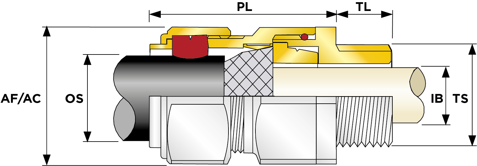 | Part Number | Size | Material | Entry Thread | Entry Thread Size TS | Entry Thread Pitch TP | Min Overall Cable Ø OS (mm) | Max Overall Cable Ø OS (mm) | Min Overall Cable Ø OS (Imp) | Max Overall Cable Ø OS (Imp) | Min Thread Length TL (mm) | Min Thread Length TL (Imp) | Max Across Flats AF (mm) | Max Across Corners AC (mm) | Max Across Flats AF (Imp) | Max Across Corners AC (Imp) | Max Protrusion Length PL (mm) | Max Cable Bedding Ø IB (mm) | Max Cable Bedding Ø IB (Imp) | Min Cable Bedding Ø IB (Imp) | Min Armour Thickness X Cone X1 (mm) | Max Armour Thickness X Cone X1 (mm) | Min Armour Thickness X Cone X1 (Imp) | Min Armour Thickness W Cone W1 (mm) | Max Armour Thickness W Cone W1 (mm) | Min Armour Thickness W Cone W1 (Imp) | Max Armour Thickness W Cone W1 (Imp) | Shroud Size | Ass'y Weight | |