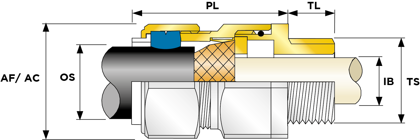| Part Number | Size | Material | Entry Thread | Entry Thread Size TS | Entry Thread Pitch TP | Min Overall Cable Ø OS (mm) | Max Overall Cable Ø OS (mm) | Min Overall Cable Ø OS (Imp) | Max Overall Cable Ø OS (Imp) | Min Thread Length TL (mm) | Min Thread Length TL (Imp) | Max Across Flats AF (mm) | Max Across Corners AC (mm) | Max Across Flats AF (Imp) | Max Across Corners AC (Imp) | Max Protrusion Length PL (mm) | Max Cable Bedding Ø IB (mm) | Max Cable Bedding Ø IB (Imp) | Min Cable Bedding Ø IB (Imp) | Min Armour Thickness X Cone X1 (mm) | Max Armour Thickness X Cone X1 (mm) | Min Armour Thickness X Cone X1 (Imp) | Shroud Size | Ass'y Weight | |