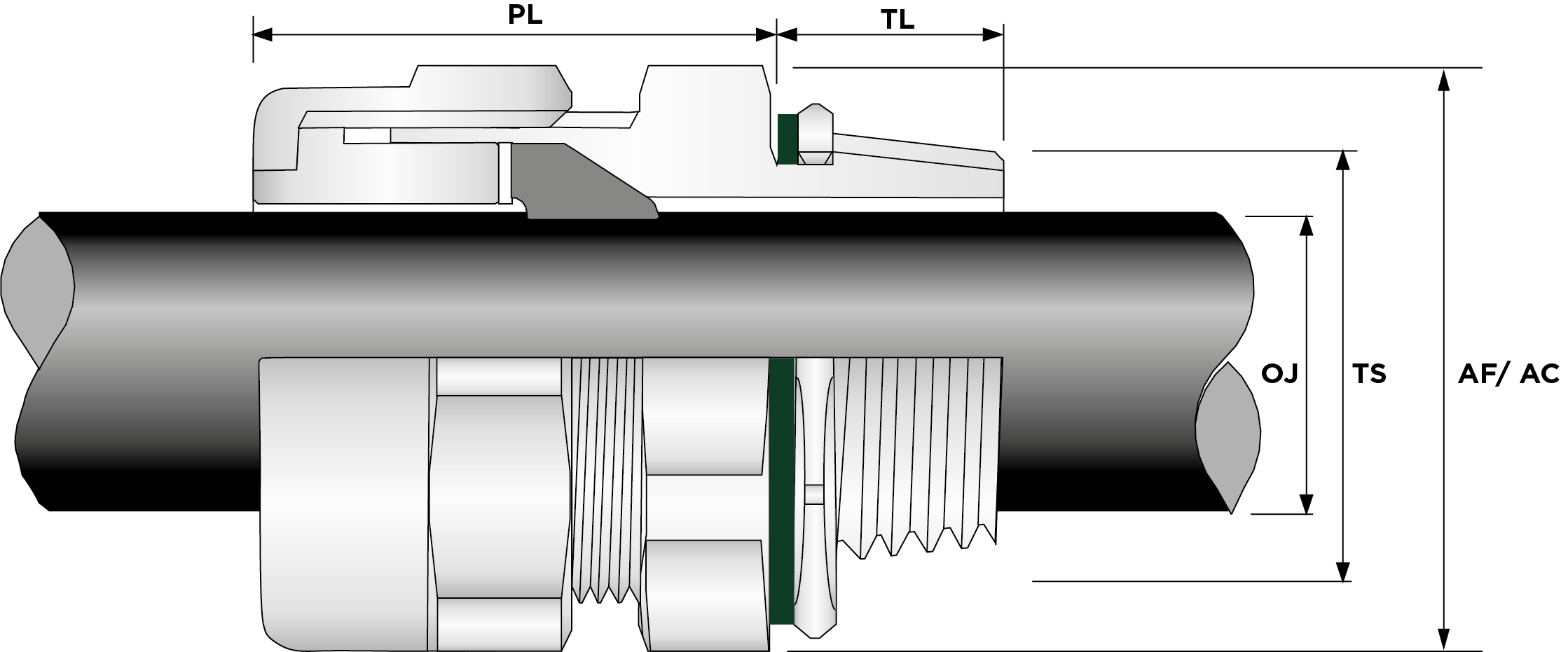 | Part Number | Size | Material | Entry Thread | Entry Thread Size TS | Min Overall Cable Ø OS (mm) | Max Overall Cable Ø OS (mm) | Min Overall Cable Ø OS (Imp) | Max Overall Cable Ø OS (Imp) | Min Thread Length TL (mm) | Min Thread Length TL (Imp) | Max Across Flats AF (mm) | Max Across Corners AC (mm) | Max Across Flats AF (Imp) | Max Across Corners AC (Imp) | Max Protrusion Length PL (mm) | |