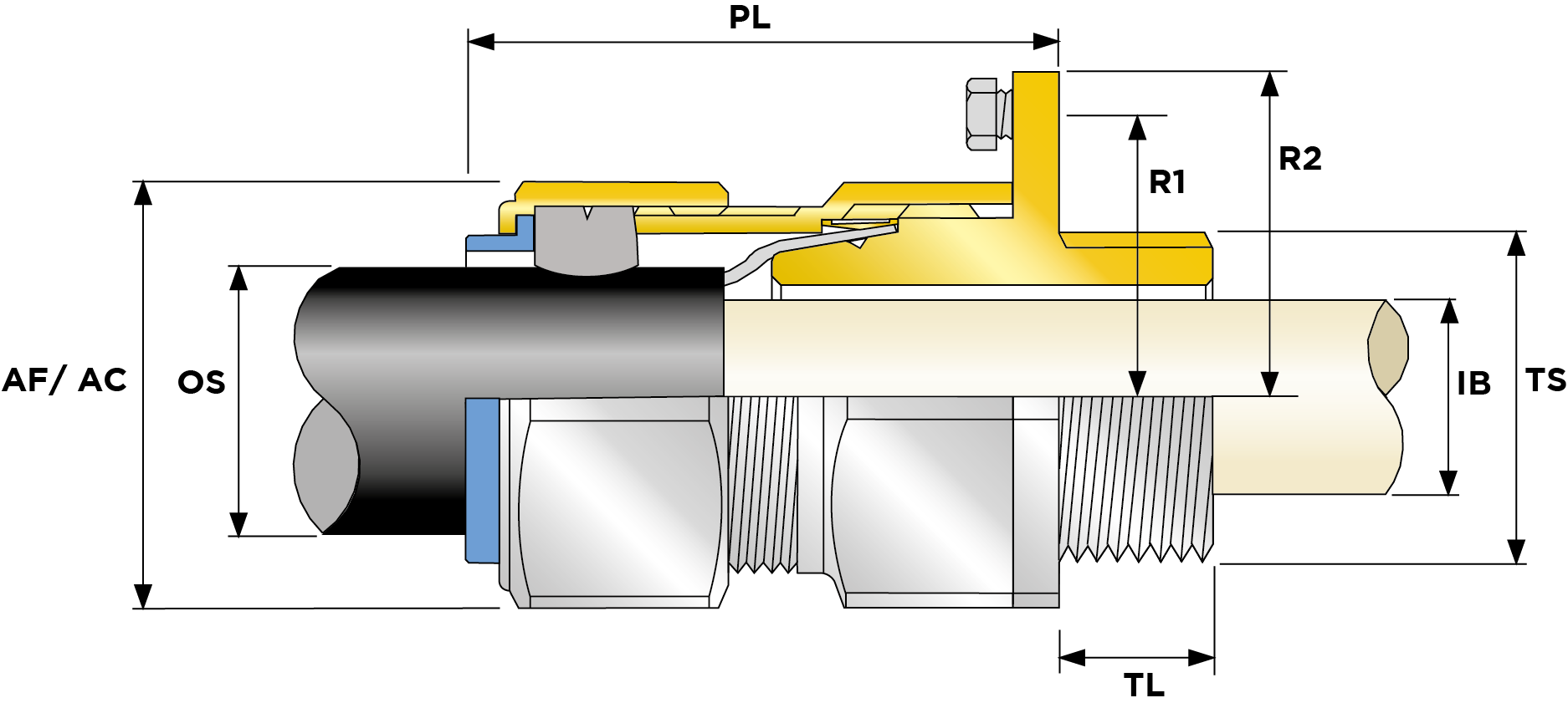 | Part Number | Size | Material | CIEL Earth Bolt Size EB | Entry Thread | Entry Thread Size TS | Entry Thread Pitch TP | Min Overall Cable Ø OS (mm) | Max Overall Cable Ø OS (mm) | Min Overall Cable Ø OS (Imp) | Max Overall Cable Ø OS (Imp) | Min Thread Length TL (mm) | Min Thread Length TL (Imp) | Max Across Flats AF (mm) | Max Across Corners AC (mm) | Max Across Flats AF (Imp) | Max Across Corners AC (Imp) | Symmetrical Fault Current (kA) rating for 1 second | Max Protrusion Length PL (mm) | Nom C-to-C Radius R1 (mm) | Nom C-to-Extremity Radius R2 (mm) | Max Cable Bedding Ø IB (mm) | Max Cable Bedding Ø IB (Imp) | Min Cable Bedding Ø IB (Imp) | Min Armour Thickness W Cone W1 (mm) | Max Armour Thickness W Cone W1 (mm) | Min Armour Thickness W Cone W1 (Imp) | Max Armour Thickness W Cone W1 (Imp) | Ass'y Weight | |