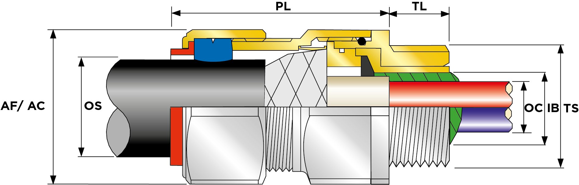 | Part Number | Size | Material | Entry Thread | Entry Thread Size TS | Entry Thread Pitch TP | Min Overall Cable Ø OS (mm) | Max Overall Cable Ø OS (mm) | Min Overall Cable Ø OS (Imp) | Max Overall Cable Ø OS (Imp) | Max Ø Over Conductors (mm) | Max Ø Over Conductors (Imp) | Max No. of Conductors NC | Min Thread Length TL (mm) | Min Thread Length TL (Imp) | Max Across Flats AF (mm) | Max Across Corners AC (mm) | Max Across Flats AF (Imp) | Max Across Corners AC (Imp) | Max Protrusion Length PL (mm) | Max Cable Bedding Ø IB (mm) | Max Cable Bedding Ø IB (Imp) | Min Cable Bedding Ø IB (Imp) | Min Armour Thickness X Cone X1 (mm) | Max Armour Thickness X Cone X1 (mm) | Min Armour Thickness X Cone X1 (Imp) | Shroud Size | Ass'y Weight | |