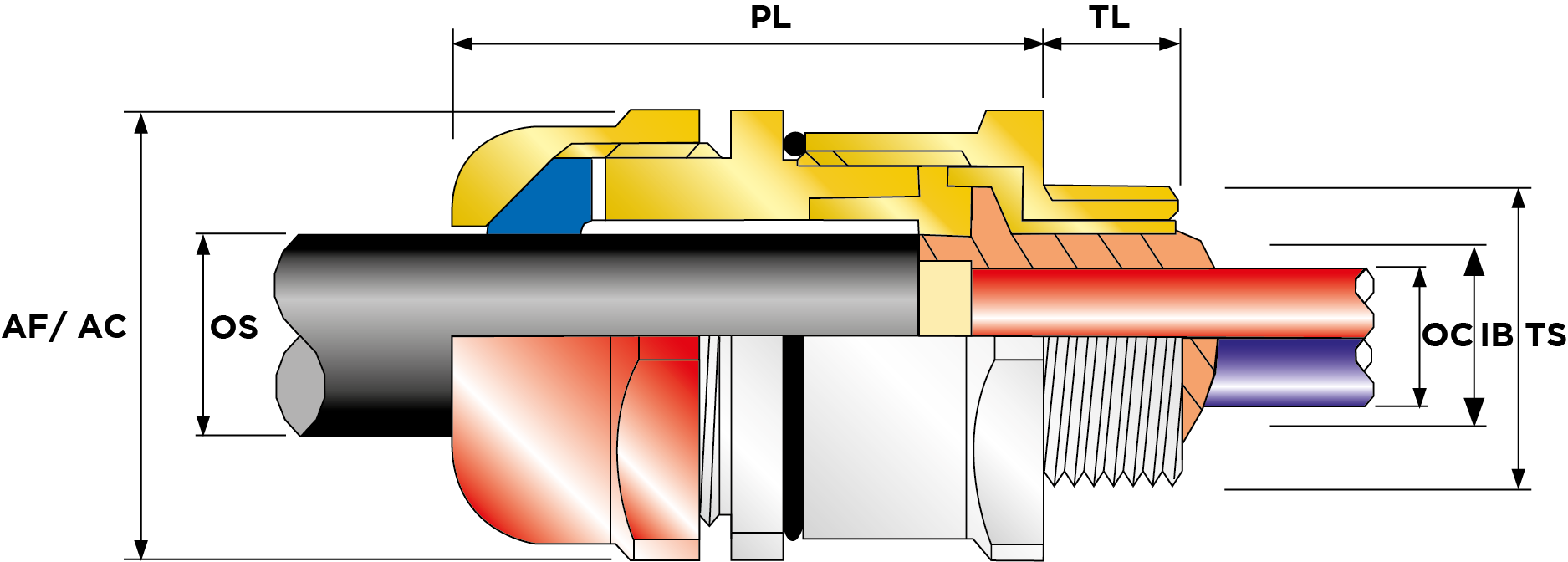 | Part Number | Size | Material | Entry Thread | Entry Thread Size TS | Entry Thread Pitch TP | Min Overall Cable Ø OS (mm) | Max Overall Cable Ø OS (mm) | Min Overall Cable Ø OS (Imp) | Max Overall Cable Ø OS (Imp) | Min Thread Length TL (mm) | Min Thread Length TL (Imp) | Max Across Flats AF (mm) | Max Across Corners AC (mm) | Max Across Flats AF (Imp) | Max Across Corners AC (Imp) | Max Protrusion Length PL (mm) | Max Cable Bedding Ø IB (mm) | Max Cable Bedding Ø IB (Imp) | Min Cable Bedding Ø IB (Imp) | Shroud Size | Ass'y Weight | |