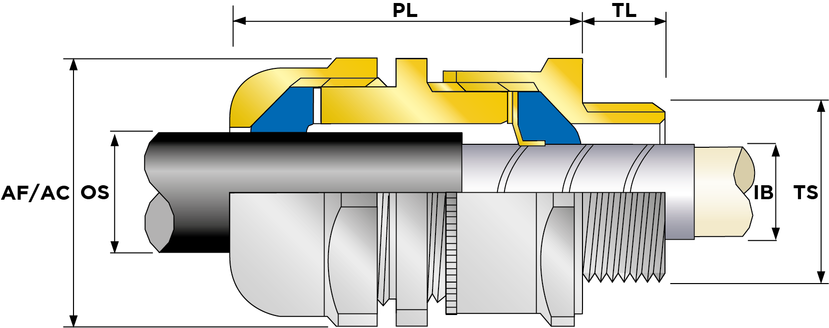 | Part Number | Size | Material | Entry Thread | Entry Thread Size TS | Entry Thread Pitch TP | Min Overall Cable Ø OS (mm) | Max Overall Cable Ø OS (mm) | Min Overall Cable Ø OS (Imp) | Max Overall Cable Ø OS (Imp) | Min Thread Length TL (mm) | Min Thread Length TL (Imp) | Max Across Flats AF (mm) | Max Across Corners AC (mm) | Max Across Flats AF (Imp) | Max Across Corners AC (Imp) | Max Protrusion Length PL (mm) | Shroud Size | Ass'y Weight | |