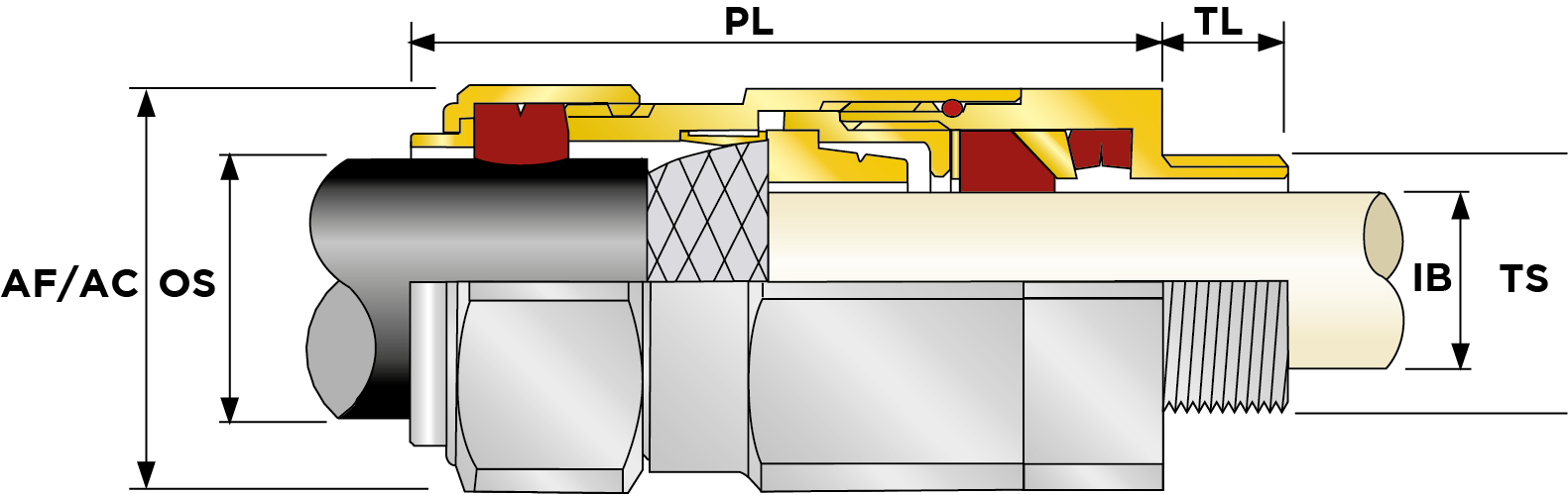| Part Number | Size | Material | Entry Thread | Entry Thread Size TS | Entry Thread Pitch TP | Min Overall Cable Ø OS (mm) | Max Overall Cable Ø OS (mm) | Min Overall Cable Ø OS (Imp) | Max Overall Cable Ø OS (Imp) | Min Thread Length TL (mm) | Min Thread Length TL (Imp) | Max Across Flats AF (mm) | Max Across Corners AC (mm) | Max Across Flats AF (Imp) | Max Across Corners AC (Imp) | Max Protrusion Length PL (mm) | Min Cable Bedding Ø IB (mm) | Max Cable Bedding Ø IB (mm) | Max Cable Bedding Ø IB (Imp) | Min Cable Bedding Ø IB (Imp) | Min Armour Thickness X Cone X1 (mm) | Max Armour Thickness X Cone X1 (mm) | Min Armour Thickness X Cone X1 (Imp) | Min Armour Thickness W Cone W1 (mm) | Max Armour Thickness W Cone W1 (mm) | Min Armour Thickness W Cone W1 (Imp) | Max Armour Thickness W Cone W1 (Imp) | Shroud Size | Ass'y Weight | |