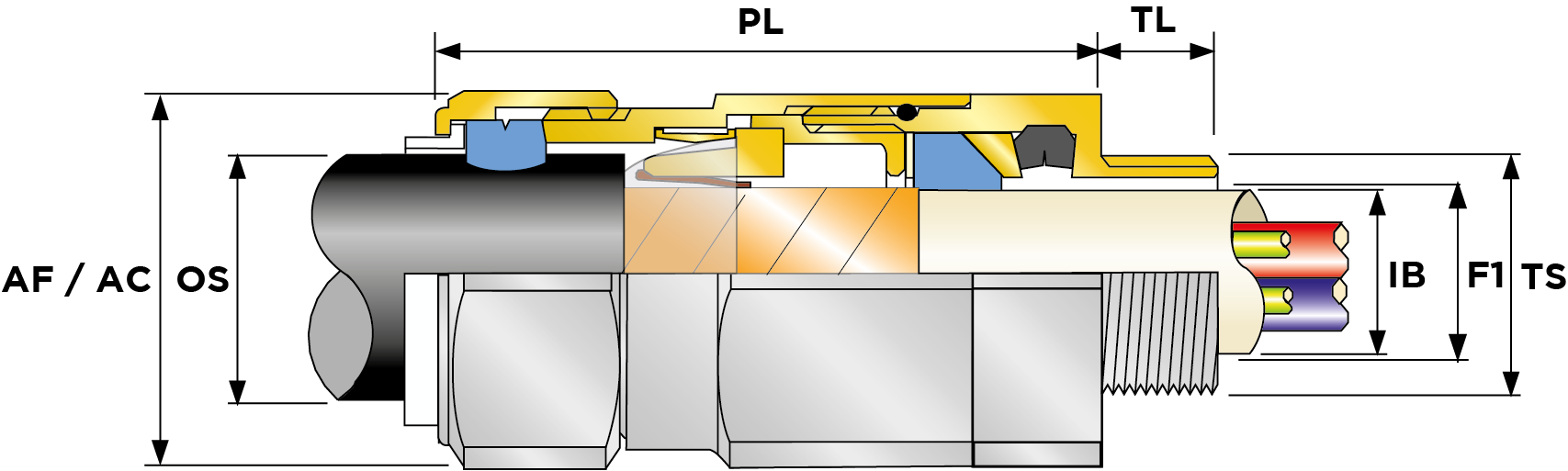 | Part Number | Size | Material | Entry Thread | Entry Thread Size TS | Entry Thread Pitch TP | Min Overall Cable Ø OS (mm) | Max Overall Cable Ø OS (mm) | Min Overall Cable Ø OS (Imp) | Max Overall Cable Ø OS (Imp) | Min Thread Length TL (mm) | Min Thread Length TL (Imp) | Max Across Flats AF (mm) | Max Across Corners AC (mm) | Max Across Flats AF (Imp) | Max Across Corners AC (Imp) | Max Protrusion Length PL (mm) | Min Cable Bedding Ø IB (mm) | Max Cable Bedding Ø IB (mm) | Max Cable Bedding Ø IB (Imp) | Min Cable Bedding Ø IB (Imp) | Min VAR Tape Ø (mm) | Min VAR Tape Ø (Imp) | Max VAR Tape Ø (Imp) | Min Armour Thickness X Cone X1 (mm) | Max Armour Thickness X Cone X1 (mm) | Min Armour Thickness X Cone X1 (Imp) | Min Armour Thickness W Cone W1 (mm) | Max Armour Thickness W Cone W1 (mm) | Min Armour Thickness W Cone W1 (Imp) | Max Armour Thickness W Cone W1 (Imp) | Shroud Size | Ass'y Weight | |