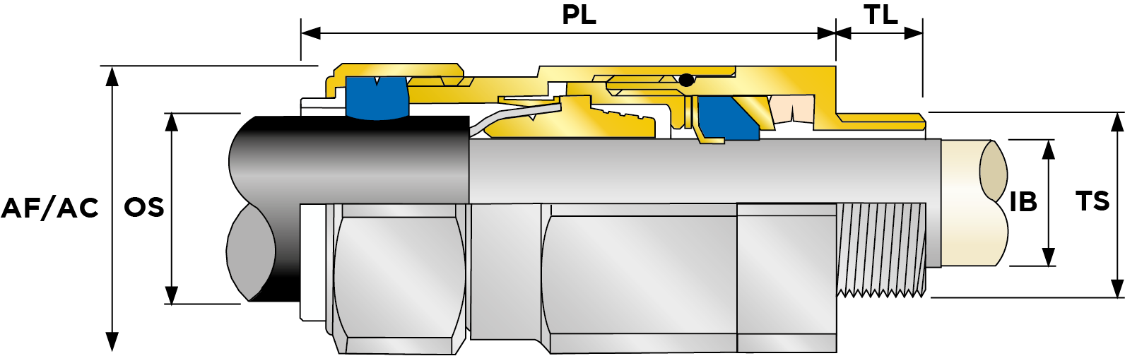 | Part Number | Size | Material | Entry Thread | Entry Thread Size TS | Entry Thread Pitch TP | Min Overall Cable Ø OS (mm) | Max Overall Cable Ø OS (mm) | Min Overall Cable Ø OS (Imp) | Max Overall Cable Ø OS (Imp) | Min Thread Length TL (mm) | Min Thread Length TL (Imp) | Max Across Flats AF (mm) | Max Across Corners AC (mm) | Max Across Flats AF (Imp) | Max Across Corners AC (Imp) | Max Protrusion Length PL (mm) | Min Lead Sheath Ø (mm) | Max Lead Sheath Ø (mm) | Min Lead Sheath Ø (Imp) | Max Lead Sheath Ø (Imp) | Min Armour Thickness W Cone W1 (mm) | Max Armour Thickness W Cone W1 (mm) | Min Armour Thickness W Cone W1 (Imp) | Max Armour Thickness W Cone W1 (Imp) | Shroud Size | Ass'y Weight | |