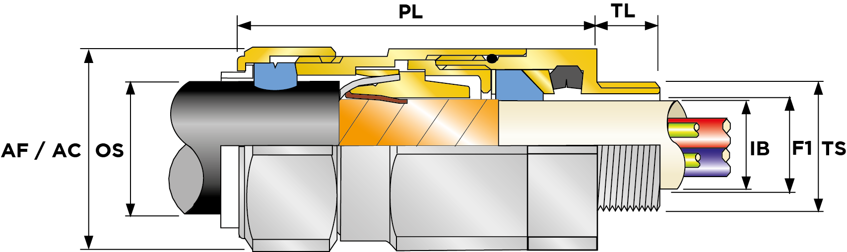 | Part Number | Size | Material | Entry Thread | Entry Thread Size TS | Entry Thread Pitch TP | Min Overall Cable Ø OS (mm) | Max Overall Cable Ø OS (mm) | Min Overall Cable Ø OS (Imp) | Max Overall Cable Ø OS (Imp) | Min Thread Length TL (mm) | Min Thread Length TL (Imp) | Max Across Flats AF (mm) | Max Across Corners AC (mm) | Max Across Flats AF (Imp) | Max Across Corners AC (Imp) | Max Protrusion Length PL (mm) | Min Cable Bedding Ø IB (mm) | Max Cable Bedding Ø IB (mm) | Max Cable Bedding Ø IB (Imp) | Min Cable Bedding Ø IB (Imp) | Min VAR Tape Ø (mm) | Min VAR Tape Ø (Imp) | Max VAR Tape Ø (mm) | Max VAR Tape Ø (Imp) | Min Armour Thickness W Cone W1 (mm) | Max Armour Thickness W Cone W1 (mm) | Min Armour Thickness W Cone W1 (Imp) | Max Armour Thickness W Cone W1 (Imp) | Shroud Size | Ass'y Weight | |