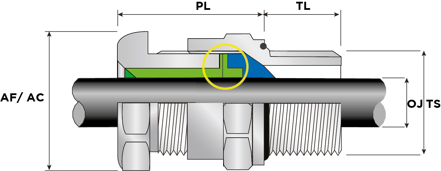 | Part Number | Size | Material | Entry Thread | Entry Thread Size TS | Entry Thread Pitch TP | Min Thread Length TL (mm) | Min Thread Length TL (Imp) | Max Across Flats AF (mm) | Max Across Corners AC (mm) | Max Across Flats AF (Imp) | Max Across Corners AC (Imp) | Max Protrusion Length PL (mm) | Minimum Cable Jacket Diameter OJ With Insert (mm) | Maximum Cable Jacket Diameter OJ With Insert (mm) | Min Cable Jacket Ø w/o Insert OJ (mm) | |