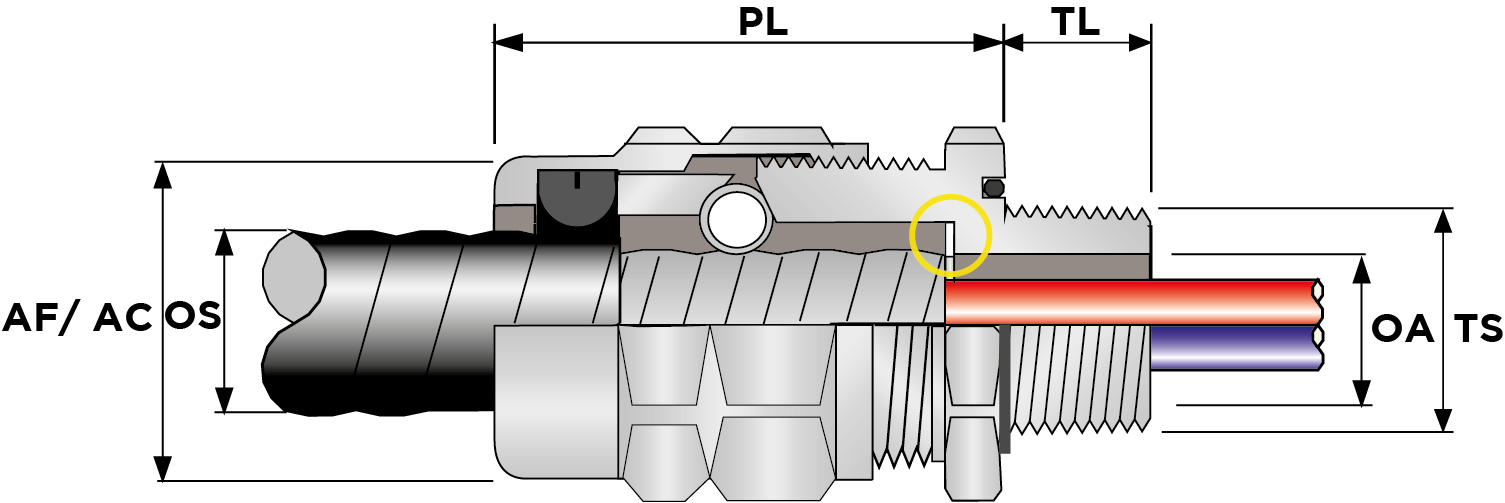 | Part Number | Size | Material | Entry Thread | Entry Thread Size TS | Entry Thread Pitch TP | Min Overall Cable Ø OS (mm) | Max Overall Cable Ø OS (mm) | Min Overall Cable Ø OS (Imp) | Max Overall Cable Ø OS (Imp) | Min Thread Length TL (mm) | Min Thread Length TL (Imp) | Max Across Flats AF (mm) | Max Across Corners AC (mm) | Max Across Flats AF (Imp) | Max Across Corners AC (Imp) | Max Protrusion Length PL (mm) | Min Over Armour Ø OA Arm-Stop In (mm) | Max Over Armour Ø OA Arm-Stop In (mm) | Max Over Armour Ø OA Arm-Stop Out (mm) | ||