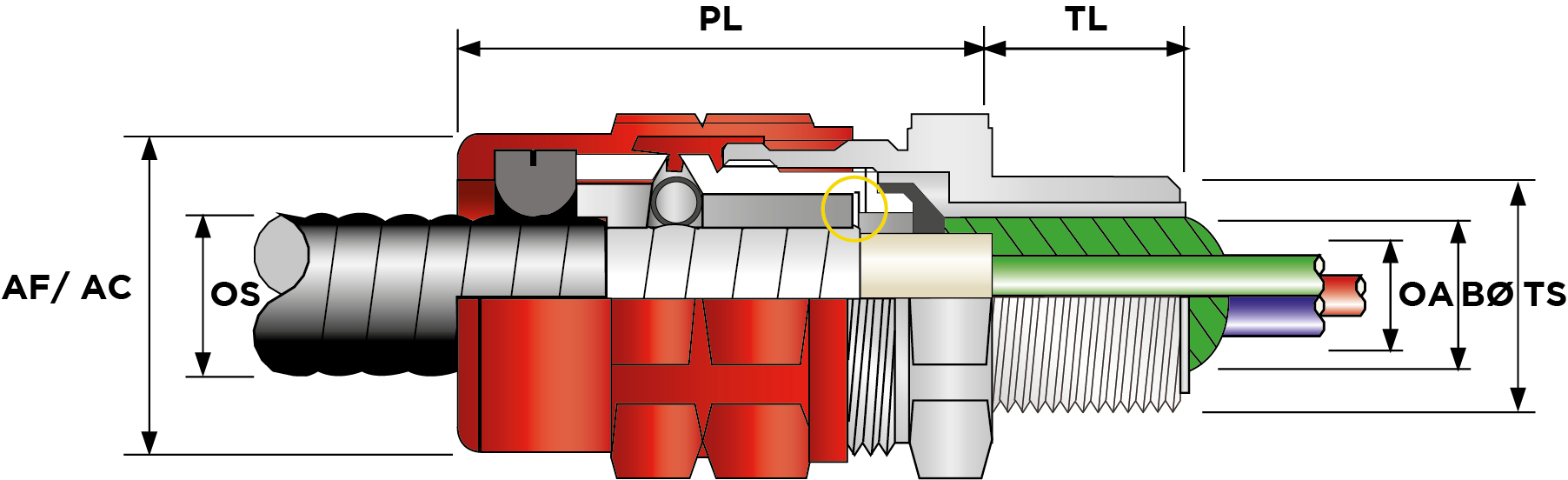 | Part Number | Size | Material | Entry Thread | Entry Thread Size TS | Entry Thread Pitch TP | Min Overall Cable Ø OS (mm) | Max Overall Cable Ø OS (mm) | Min Overall Cable Ø OS (Imp) | Max Overall Cable Ø OS (Imp) | Max Ø Over Conductors (mm) | Max Ø Over Conductors (Imp) | Min Thread Length TL (mm) | Min Thread Length TL (Imp) | Max Across Flats AF (mm) | Max Across Corners AC (mm) | Max Across Flats AF (Imp) | Max Across Corners AC (Imp) | Max Protrusion Length PL (mm) | Min Over Armour Ø OA Arm-Stop In (mm) | Max Over Armour Ø OA Arm-Stop In (mm) | Max Over Armour Ø OA Arm-Stop Out (mm) | ||