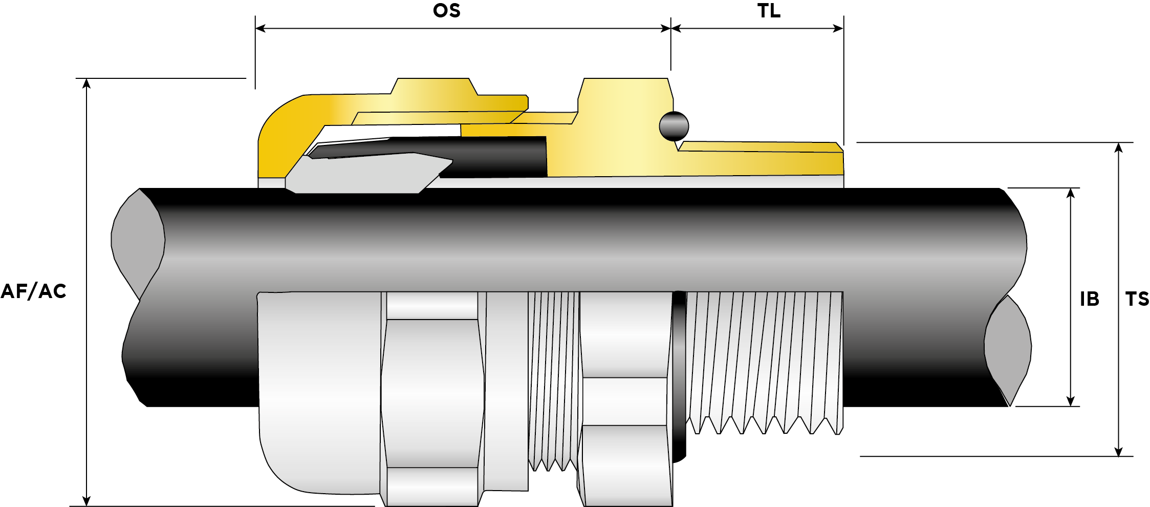 | Part Number | Size | Material | Entry Thread | Entry Thread Size TS | Entry Thread Pitch TP | Min Overall Cable Ø OS (mm) | Max Overall Cable Ø OS (mm) | Min Overall Cable Ø OS (Imp) | Max Overall Cable Ø OS (Imp) | Min Thread Length TL (mm) | Min Thread Length TL (Imp) | Max Across Flats AF (mm) | Max Across Corners AC (mm) | Max Across Flats AF (Imp) | Max Across Corners AC (Imp) | Max Protrusion Length PL (mm) | |