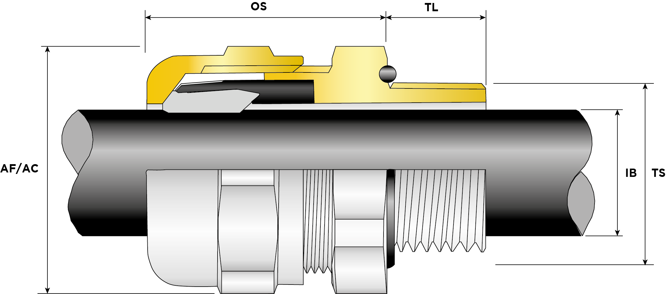 | Part Number | Size | Material | Entry Thread | Entry Thread Size TS | Entry Thread Pitch TP | Min Overall Cable Ø OS (mm) | Max Overall Cable Ø OS (mm) | Min Overall Cable Ø OS (Imp) | Max Overall Cable Ø OS (Imp) | Min Thread Length TL (mm) | Min Thread Length TL (Imp) | Max Across Flats AF (mm) | Max Across Corners AC (mm) | Max Across Flats AF (Imp) | Max Across Corners AC (Imp) | Max Protrusion Length PL (mm) | |