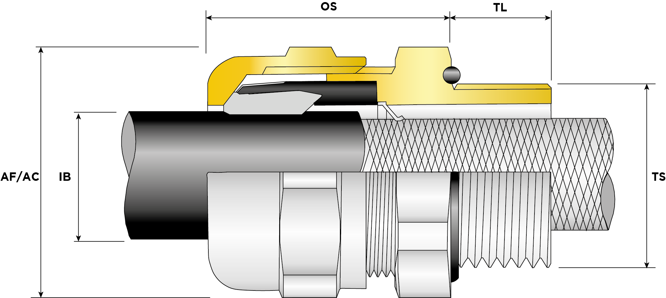 | Part Number | Size | Material | Entry Thread | Entry Thread Size TS | Entry Thread Pitch TP | Min Overall Cable Ø OS (mm) | Max Overall Cable Ø OS (mm) | Min Overall Cable Ø OS (Imp) | Max Overall Cable Ø OS (Imp) | Min Thread Length TL (mm) | Min Thread Length TL (Imp) | Max Across Flats AF (mm) | Max Across Corners AC (mm) | Max Across Flats AF (Imp) | Max Across Corners AC (Imp) | Max Protrusion Length PL (mm) | |